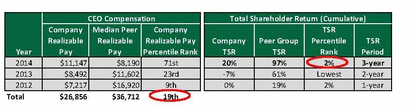 In the three year history of CEO compensation in the SEC-mandated table above, CAP was significantly below Summary Compensation Table pay in 2013 and 2014. CAP in 2012 approximates SCT pay, but 2012 was an unusual year for the Company due to a CEO transition, and the CAP value in 2012 includes severance and vested equity awards for our departing CEO, in addition to annual compensation for our new CEO. The disclosed level of CAP was delivered commensurate with 3-year cumulative TSR of 20%, which was below the 3-year TSR for the peer group of 97%. Additional information on company pay-for-performance alignment is provided in the Compensation Discussion and Analysis.