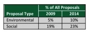 Our analysis of shareholder proposals in 2009 and 2014 shows that investors and activists are increasingly using the proxy statement and annual meeting as platforms for environmental and social activism. While shareholder proposals of a social nature still represent the majority of E+S proposals, the portion of shareholder proposals with environmental aims has doubled in the past five years.