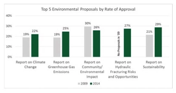 Patterns are similar among environmental shareholder proposals, with strong minority support for proposals requesting reporting on sustainability and hydraulic fracturing opportunities and risks.