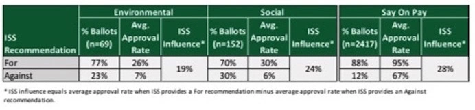 While ISS recommended “for” votes for more than 70% of E+S proposals, differential analysis for 2014 shareholder proposals suggests that ISS influences about 20% to 25% of the shareholder base on environmental and social proposals. Given ISS’ significant support for E+S shareholder proposals, it appears that individual institutional investors have set a high bar for voting “for” E+S shareholder proposals given the necessity of voting consistently with their fiduciary duties. By comparison, ISS seems to hold somewhat greater sway (28%) over other proxy matters such as Say on Pay votes: