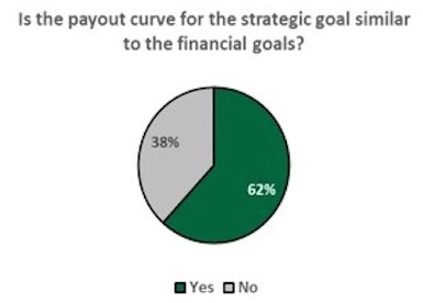 In terms of award calculation, SBOs are used much the same as financial metrics. The majority of companies (82%) add the weighted score of the strategic objectives to the weighted scores of other financial or market-based goals (an “additive” approach) instead of using a multiplicative or modifier approach. This additive method allows companies to segregate the performance assessment of SBOs and their impact on the overall award as opposed to blending SBO performance with all other results. In determining P4P leverage, the payout curve ” threshold award and maximum award ” for SBOs generally reflects the same structure as for the other financial or market-based measures on the scorecard. However, the performance levels for financial and non-financial goals are individually tailored to the measure.