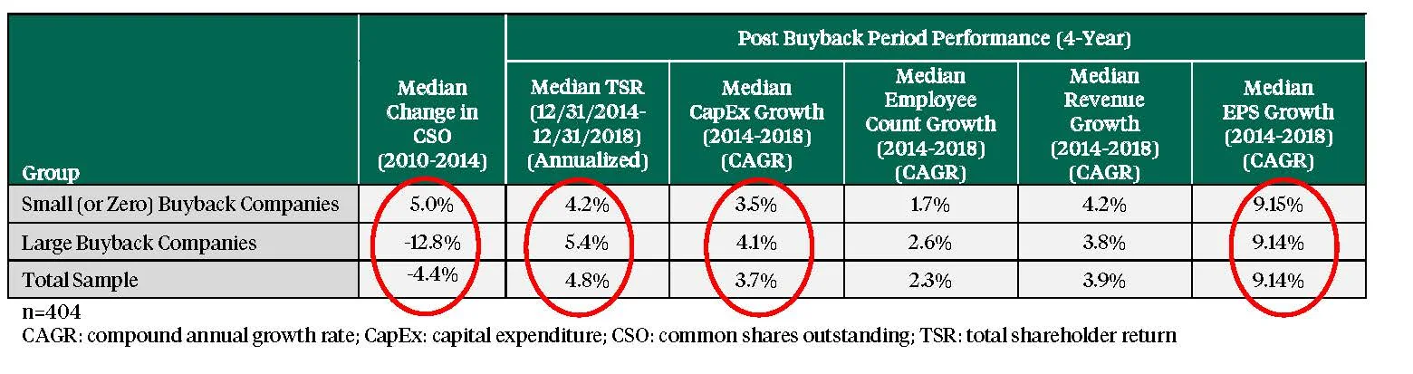 - Our research shows that buybacks do not appear to be harmful to longterm corporate performance. Companies need to continue to align executive incentives with capital decisions to continue their success.