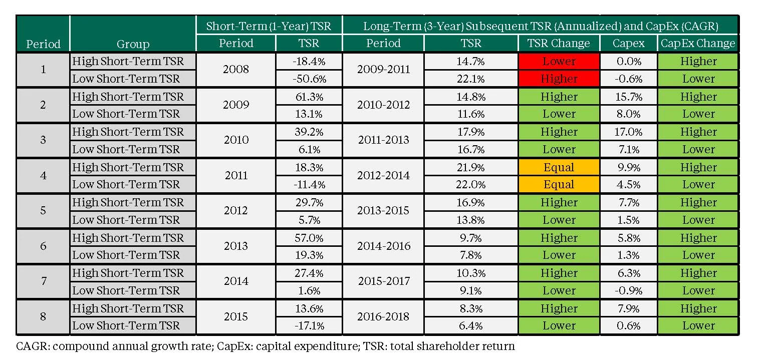 - Higher short-term (one-year) TSR is associated with higher long-term subsequent (three-year) TSRand CapEx investment. This finding suggests that companies generally do not sacrifice long-term returns or investments for short-term gains.