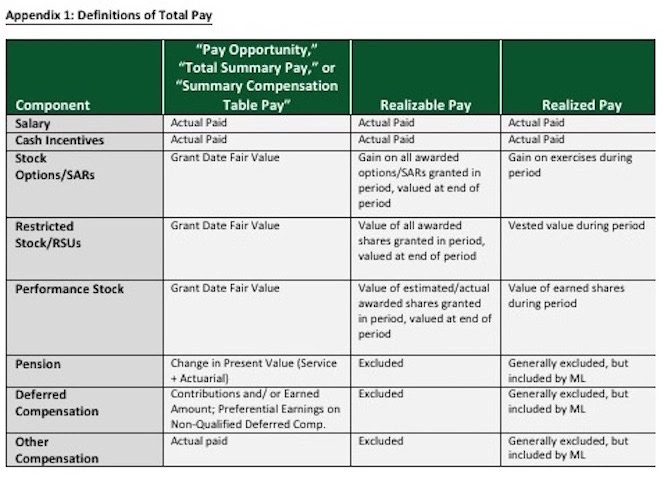 - Realizable pay and realized pay measure the magnitude of executive pay by including the in-the-money value of stock awards after grant to test alignment with shareholder returns (TSR). This is a more valid approach than using pay opportunity.