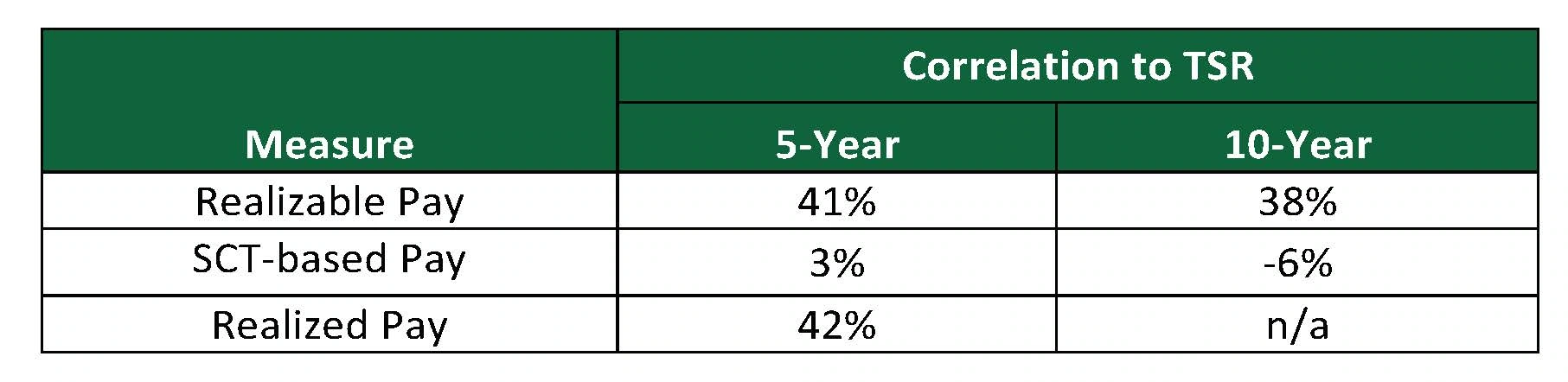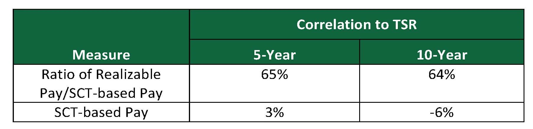 Realizable Pay has a much stronger relationship to TSR performance than compensation reflected in the Summary Compensation Table (“SCT-based Pay”). Realizable Pay is composed of cash compensation paid, cash long-term incentive payouts and the value of equity awards using the stock price at the end of the assessment period. Realized Pay is also different than SCT-based Pay, which for equity includes only equity vested or stock options exercised. Both absolute Realizable Pay and Realized Pay have much higher correlations with TSR performance than pay disclosed in proxies (SCT-based Pay includes actual cash salary and cash incentive payouts, but replaces current or realized value of equity with accounting fair value of awards and excludes pension accruals and other compensation). In our analysis, Realized Pay, which is only presented on a 5-year basis due to the limitations of pre-2007 proxy disclosures, had a comparable correlation with Realizable Pay.