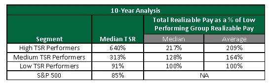- ln our assessment of CEO pay for 10 years ending in 2012 and performance through the first quarter of 2013, we demonstrate that Realizable Pay has the strongest correlation with TSR, particularly when expressed as a ratio of proxy-disclosed pay.Â