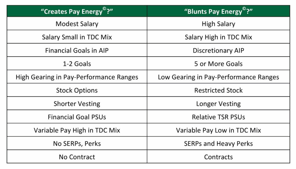 What Pay Energy© does, however, is assess almost 50 different design features typically found in executive compensation programs through one specific lens: