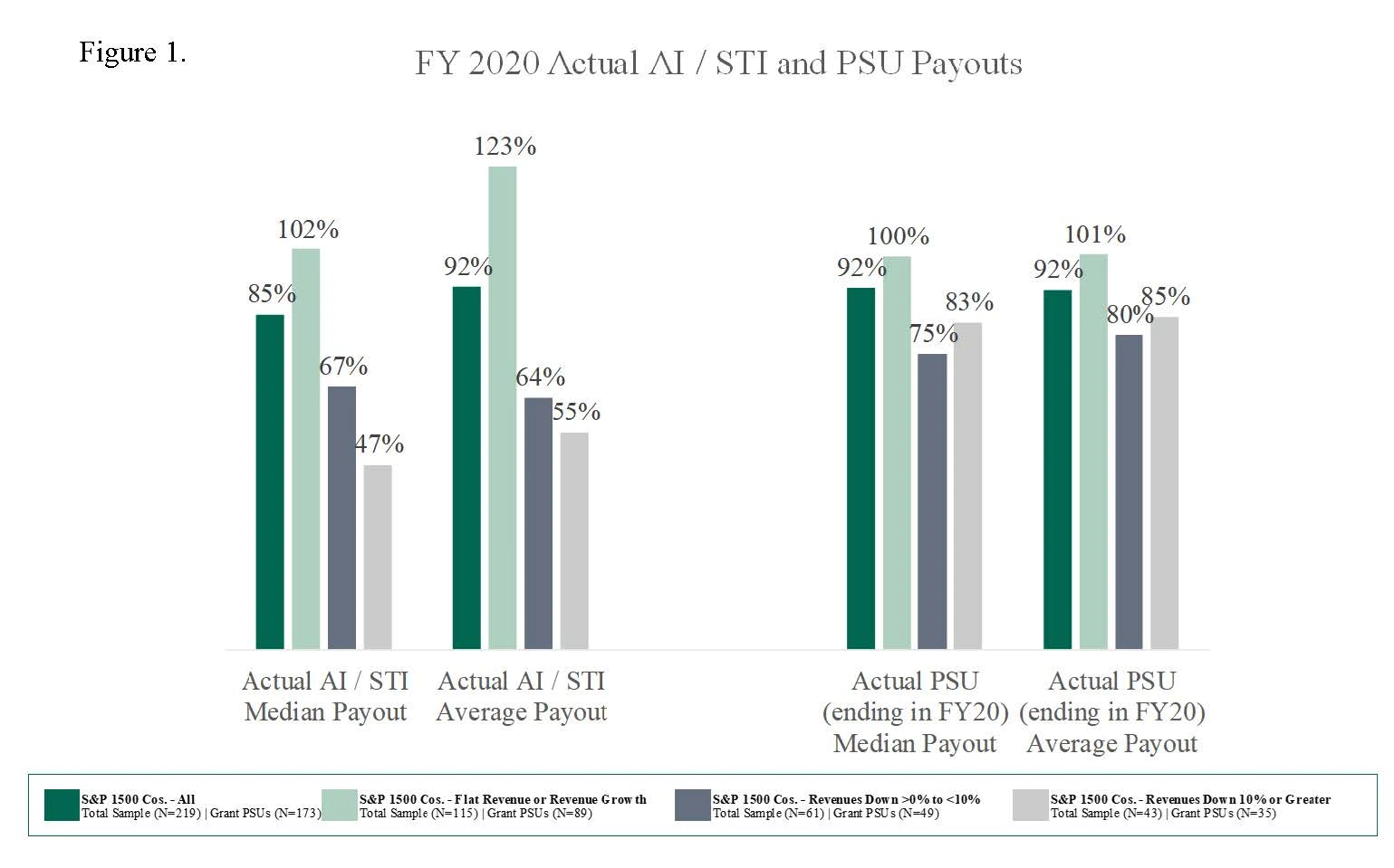 As Figure 1 below indicates, 2020 AI and PSU payouts (for cycles ending in 2020) tracked closely with business impact, as those companies with year-over-year revenue decreases in their last two fiscal quarters had noticeably lower incentive payouts as a percentage of target.