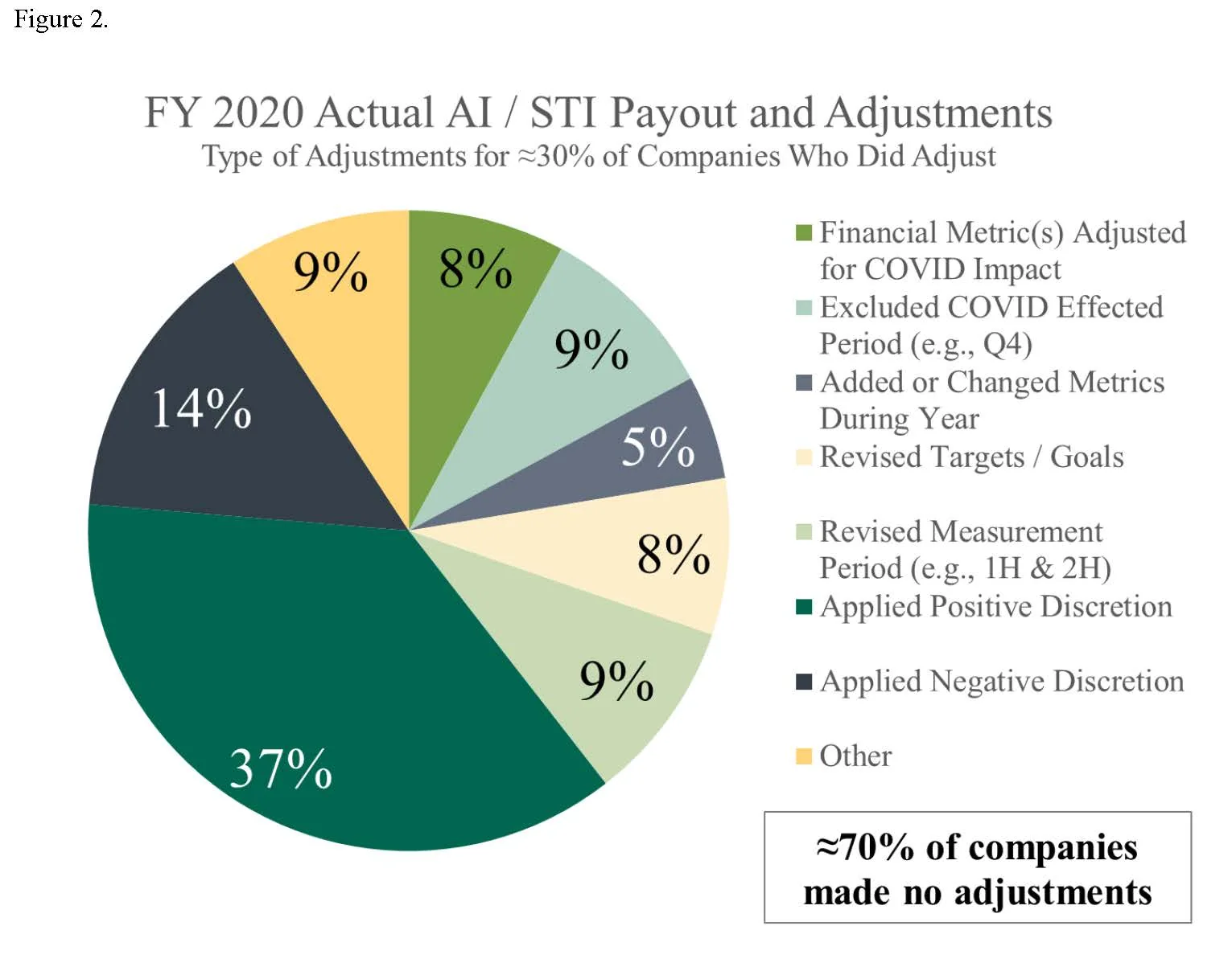 As shown in Figure 2 on the next page, most companies that adjusted AI payouts for the impact of COVID-19 relied on compensation committee discretion ” either positive or negative. Other actions included: