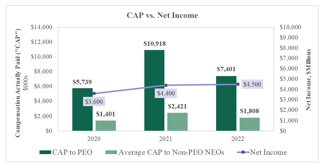As shown in the chart below, the Company’s net income has steadily increased while the PEO and other NEOs’ CAP has varied significantly each year. This is due in large part to the significant emphasis the Company places on equity incentives, which are sensitive to changes in stock price. In addition, the Company does not use net income to determine compensation levels or incentive plan payouts.