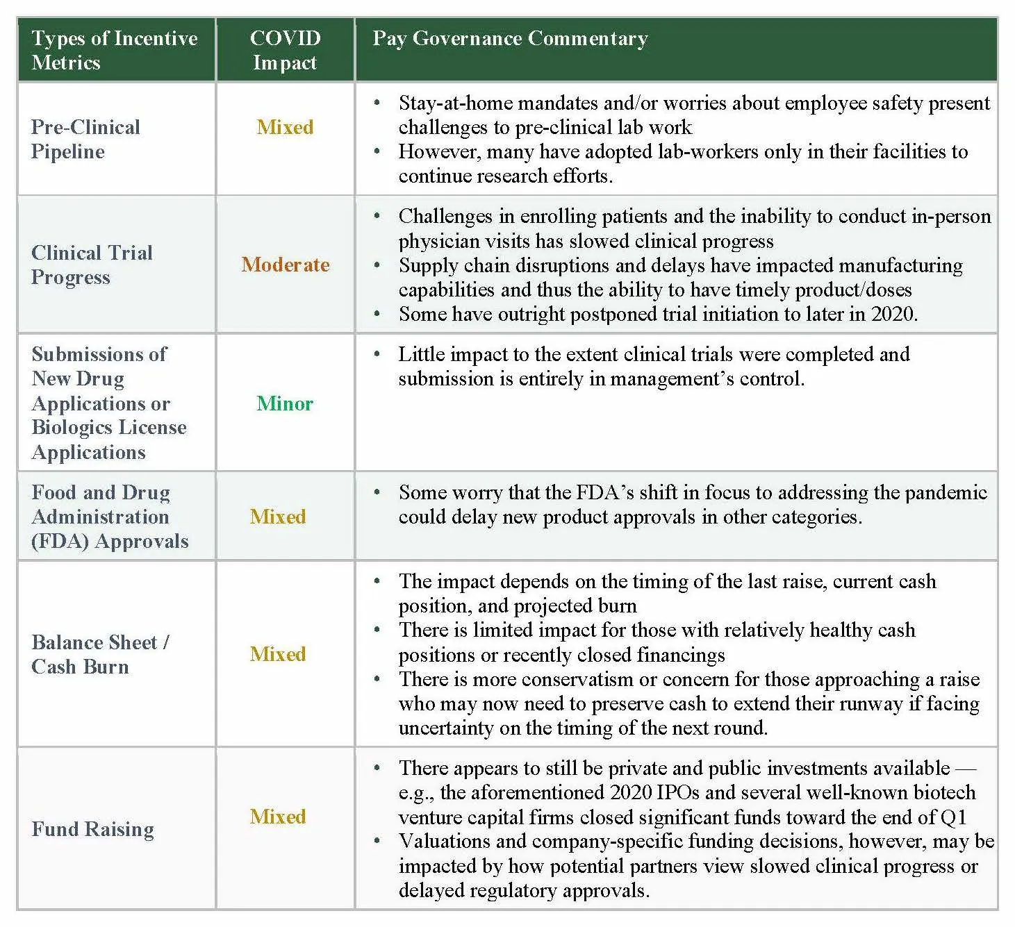 As companies in all industries consider the fact that many of their 2020 performance objectives have little chance of achievement, questions are surfacing about the possibility of resetting performance goals or replacement bonus plans, using discretion in determining payouts or adjusting performance, and/or focusing more on non-financial metrics in the absence of threshold levels of financial performance. For pre-commercial biopharmas, in an environment where cash bonus payouts are not funded by financial performance, it can be informative to assess the expected impact of COVID on common categories of incentive plan performance metrics.