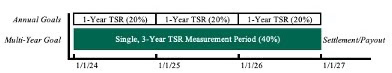 Long-term performance plans often deliver the majority of the total LTI opportunity for senior executives. These programs typically measure performance over a single 3-year period. As noted above, given the volatility and uncertainty associated with operating in cyclical or commodity-sensitive industries, it is often challenging to set 3-year financial goals. Therefore, as an alternative to setting single 3-year performance goals, some cyclical companies establish 1-year performance goals at the start of each calendar year of the 3-year performance period and also set a 3-year cumulative “wrap-around” goal. For those companies that use relative TSR as a metric, a similar approach can be used: three separate 1-year measurement periods and a single 3-year TSR measurement period (as illustrated below). Awards under this approach are determined using an average of results for the four measurement periods and are settled at the end of year 3 in order to maintain the retention value of the LTI.