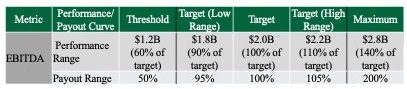 An alternative approach is the use of a “target performance range.” Under this method, a company establishes a range around the target performance goal reflecting insights regarding expected commodity price volatility or economic performance. The following example illustrates this approach for a company that uses Earnings Before Interest, Taxes, Depreciation and Amortization (EBITDA) as a performance metric, which is highly sensitive to a commodity price. The company believes that the commodity price could fluctuate between 90% and 110% of the price assumption selected for the annual business plan that is used to establish the target EBITDA performance goal. Assuming the use of a wider performance range (60% to 140% of target for threshold and maximum performance) the target range would be illustrated as follows: