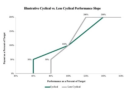 Cyclical companies typically use wider performance ranges to accommodate swings in commodity prices and economic volatility, thus reducing the frequency of maximum or zero payouts. For example, a cyclical company might use a performance range for an earnings-based metric that establishes threshold performance at 60% to 70% of targeted performance and maximum performance at 130% to 140% of targeted performance. In contrast, less cyclical companies are more likely to use a “traditional” performance range for earnings-based metrics with threshold performance set at 80% of targeted performance and maximum performance set at 120% of targeted performance. Thus, management must outperform the target goal to a greater degree to merit a maximum payout, while greater forgiveness is provided on the downside if target results are not achieved.