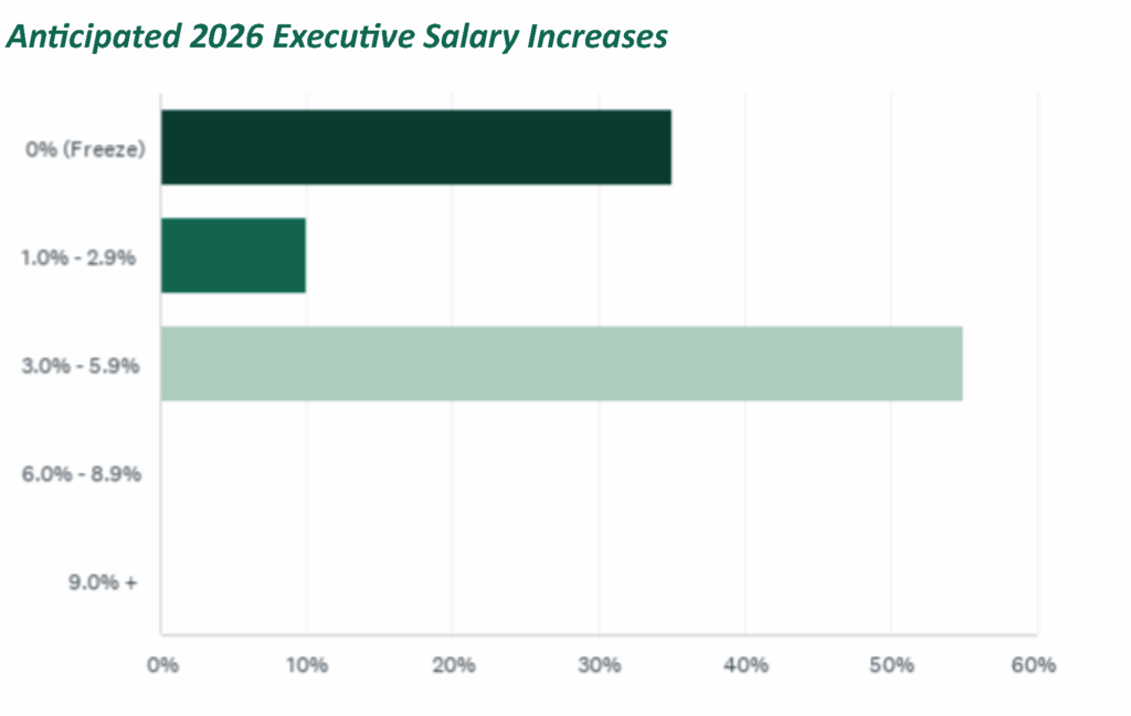 Organizations are signaling continued caution as they approach 2026 executive compensation planning. Most companies expect only moderate growth in base salaries, with more than half (55%) projecting C-suite increases in the 3.0% to 5.9% range and another 10% anticipating smaller adjustments of up to 2.9%. At the same time, 35% of organizations plan to freeze executive salaries, reflecting persistent uncertainty amid shifting market and operational conditions.