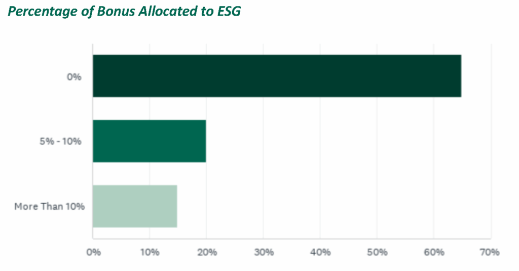 ESG integration continues its gradual ascent: 35% now allocate 5% or more of the bonus to environmental, social, and governance outcomes with an additional 20% at 5%–10% and 15% above 10%. The remaining 65% maintain zero weighting.
