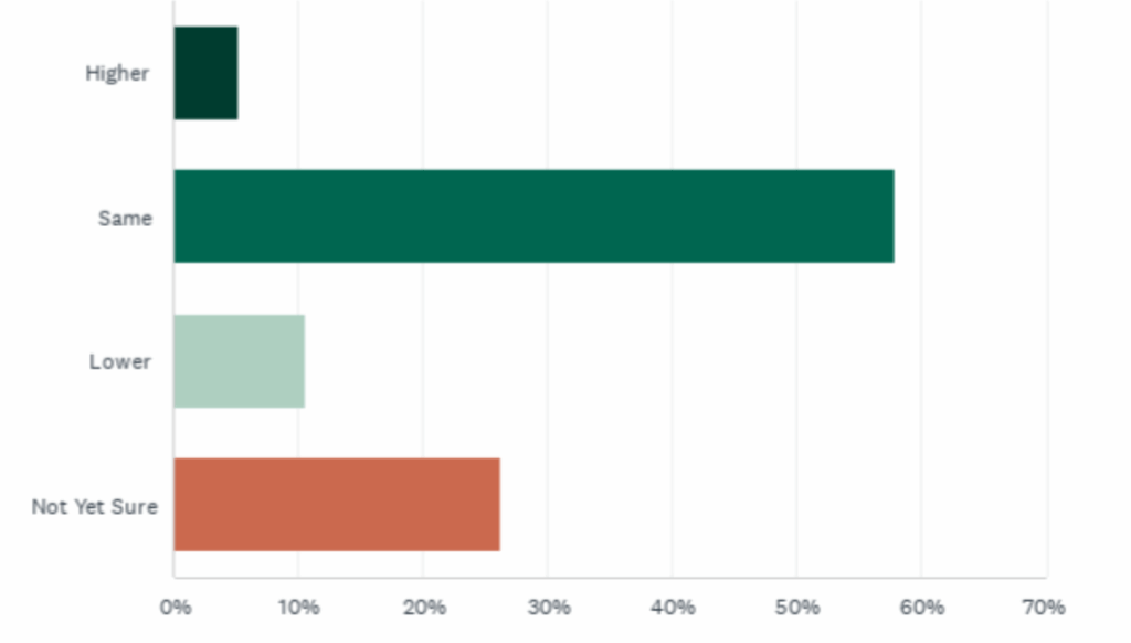 Long-term incentive (LTI) grant values are expected to remain largely stable. 58% of respondents plan to keep 2026 award values consistent with 2025 levels, while 5% anticipate increases and 11% expect reductions. The remaining 25% are undecided and plan to balance market competitiveness, overall performance, and share availability before finalizing decisions.