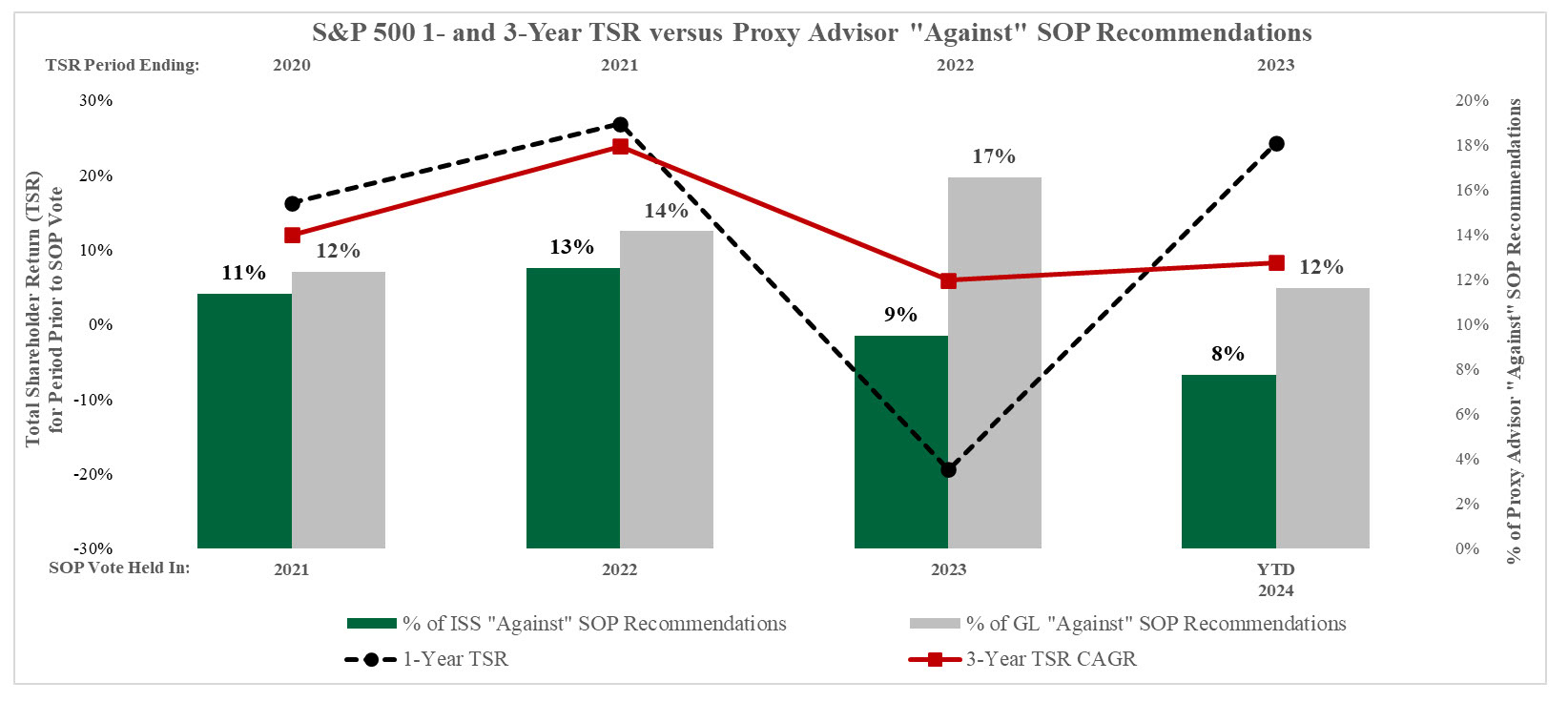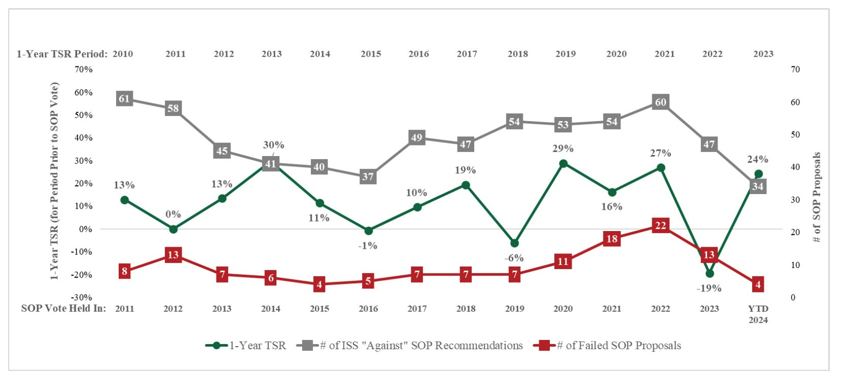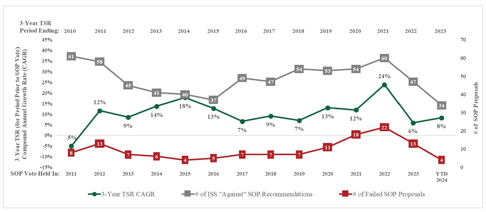 However, for 2024 the linkage of TSR performance to SOP proposal success holds true. For the period ending in 2023, 1- and 3-year TSR results (+24% and +8%, respectively) improved over the prior period and failed SOP proposals dipped to just 4 companies.