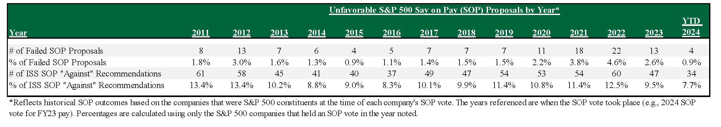 Pay Governance has compiled information on Say on Pay (SOP) outcomes and related total shareholder returns (TSR) for S&P 500 companies since the dawn of the SOP era, which dates to the 2011 proxy season. Based on our analysis of these data, this article places into context the recent results of the 2024 SOP season compared to historical trends. We find that companies have had greater success in the current SOP season, with ISS opposition to SOP proposals and the number of companies failing SOP at record lows.