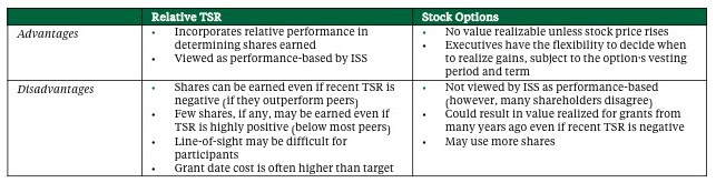 Stock options can be thought of as reflecting an Absolute TSR metric (although option recipients do not receive dividends), since any value realization requires the stock price to appreciate from the grant date price. However, while Board members, management, and many shareholders consider stock options to be performance based, Institutional Shareholder Services (ISS) does not view stock options as performance-based compensation.