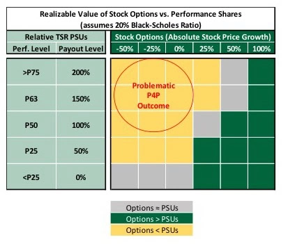 As illustrated below, the potential realizable value of Relative TSR performance shares and stock options can vary dramatically. The “problematic” pay-for-performance outcome zone highlights the importance of confirming that Relative TSR should be a measure and, if so, having appropriate safeguards.