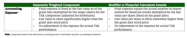 One of the key disadvantages of Relative TSR is the fair value (accounting) valuation’s complexity and the resulting disconnect of actual payouts, if any, to the recognized expense. When used as a separate component, the total expense of the Relative TSR is fixed at the date of grant (similar to stock options). However, when used as a modifier, the expense per share is fixed at the date of grant with the total expense based on the number of shares earned for financial performance.
