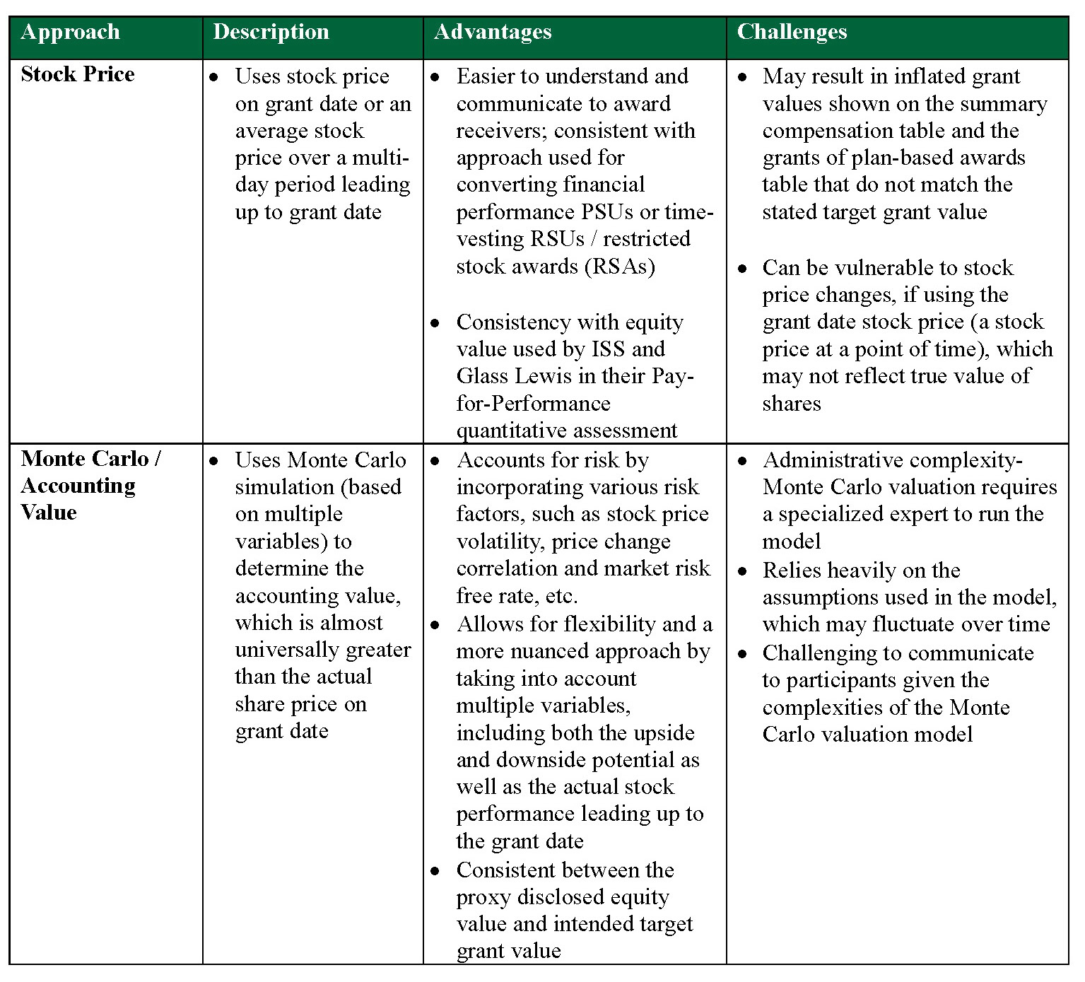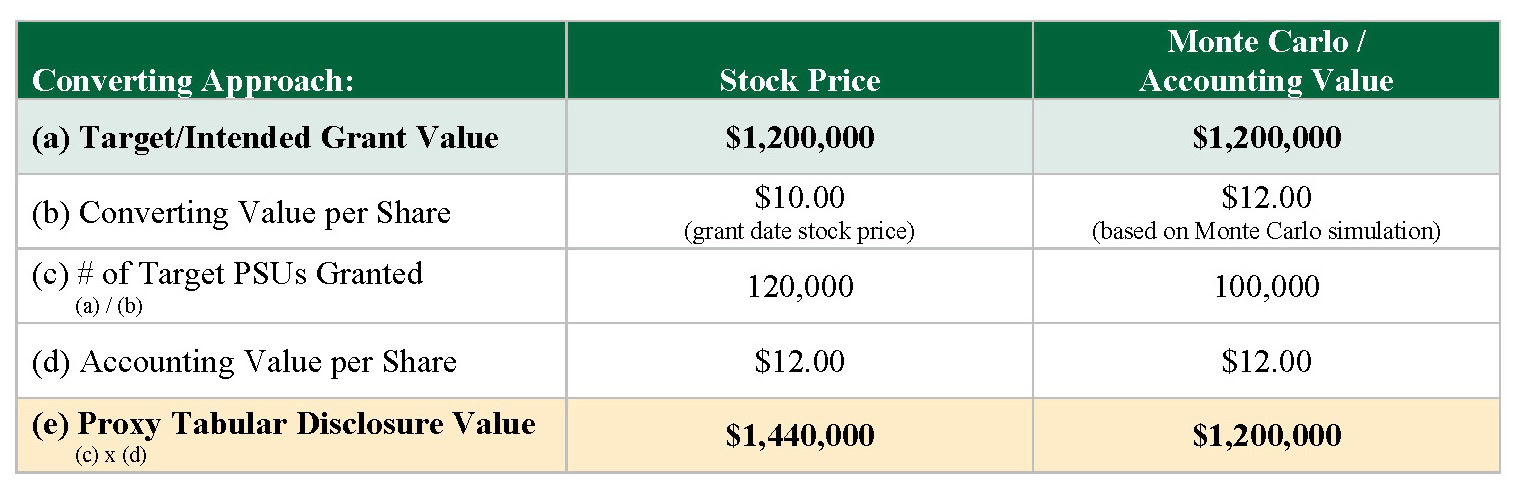 Our experience and research suggest market practice is roughly evenly split between those which convert target grant values to a number of PSU using either (i) the stock price approach or (ii) the accounting / Monte Carlo approach. The following exhibit illustrates the financial differences between these two approaches.