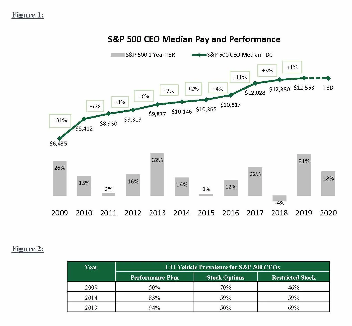 As proxies are filed in early 2021, we expect that 2020 overall CEO actual TDC will decrease, potentially by 3-4%, due to the COVID-19 pandemic and lower bonus payouts – there will be some variation with companies in strong performing industries likely seeing increases in compensation; 2020 actual pay will be balanced by steady base salaries and LTI grants, as most companies had strong financial performance at the time awards were granted (typically Q1). The last time CEO compensation decreased was during the 2008 to 2009 “Great Recession,” where the financial crisis triggered a meaningful contraction in the economy resulting in poor company performance and lower CEO pay. With regard to 2021 CEO target pay, however, we are expecting increases to be in the low single digits primarily due to some companies making “supplemental LTI grants” to partially offset for lost value for performance share plans that were damaged and mostly worthless due to the financial impact of the pandemic. Executives in industries with favorable economic conditions and higher growth (e.g., technology and biotechnology) will likely see more significant pay increases, while those in hard-hit industries may see flat or continued pay declines.