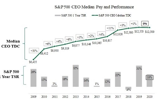 • CEO median actual pay among S&P 500 companies remained flat in 2020.