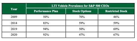 • Performance share plan usage declined slightly with 92% of S&P 500 companies employing them — likely due to the difficulty of setting multi-year goals.