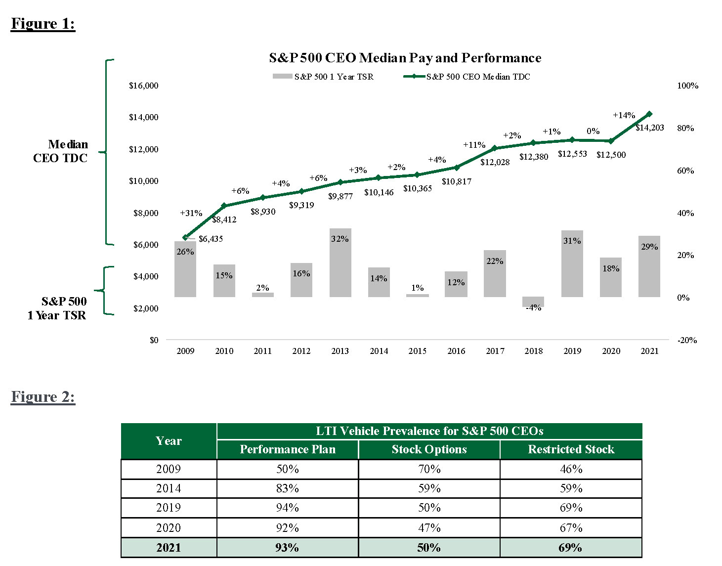 CEO pay rebounded +31% in 2010 after -9% and -13% decreases during the financial crisis of 2008 and 2009, respectively. In 2021, we observed the largest CEO pay increase since 2010, which was supported by strong three-year TSR (+29% in 2021, +18% in 2020 and +31% in 2019). (Figure 1).