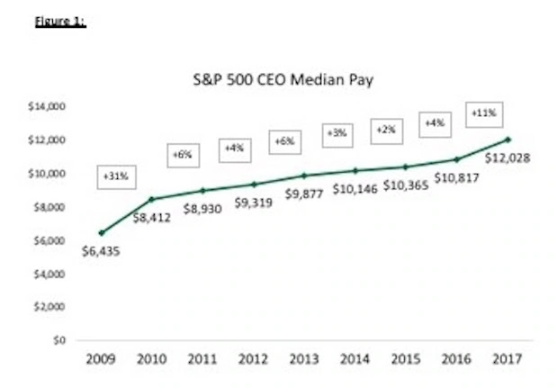 - CEO actual pay among S&P 500 companies has increased in the 2-6% range over the last several years and accelerated to 11% in 2017.