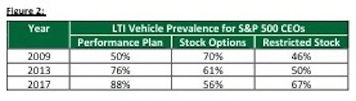 - Performance share plan usage seems to have peaked with 88% (same as prior year) of S&P 500 companies employing them while restricted stock has cemented its position with 67% prevalence.