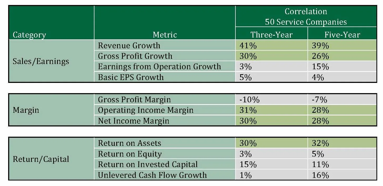 We analyzed 50 large manufacturing companies and found that the financial measures with the strongest correlation to TSR were: return on invested capital, operating income margin and net income margin. For a group of 50 service companies, we found that revenue growth had the strongest correlation with TSR, followed by gross profit, operating income margin, net income margin and return on assets.
