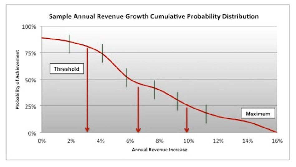 An effective approach to setting appropriate goals is to use probability analysis to determine the likelihood of attaining different levels of performance. Though this approach is only one of various tools that compensation committees may use, Pay Governance research has shown that consistently achieving goals set in this manner is associated with superior returns to shareholders. However, this wholly quantitative method is by no means a panacea; business judgment is always required.