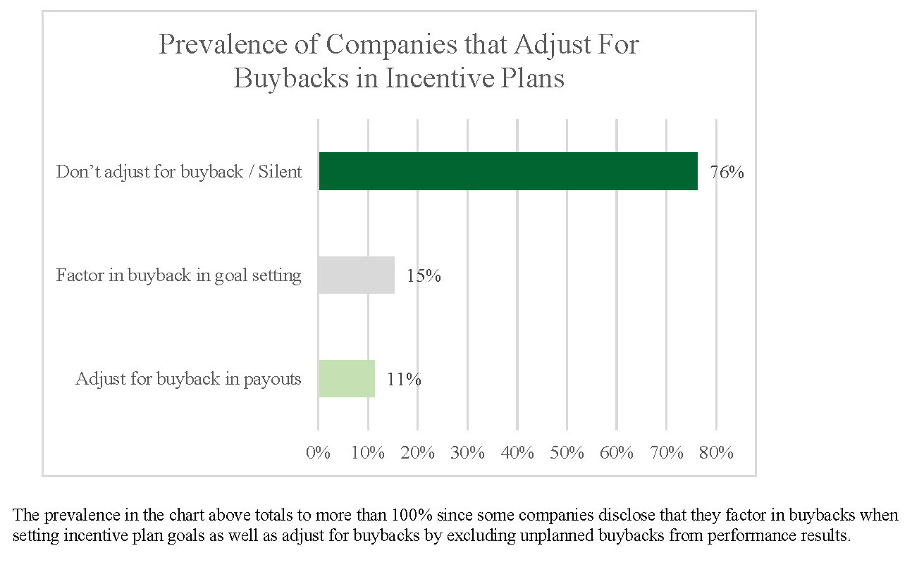 We found the remaining companies either disclose that they factor in the impact of share repurchases on shares outstanding when setting goals (15% of companies) or adjust for the impact when determining incentive awards (11% of companies). In other words, about one quarter of the companies consider the impact of share repurchases and prospectively adjust goals / set guardrails or retrospectively adjust incentive payouts to offset for the impact of buybacks.