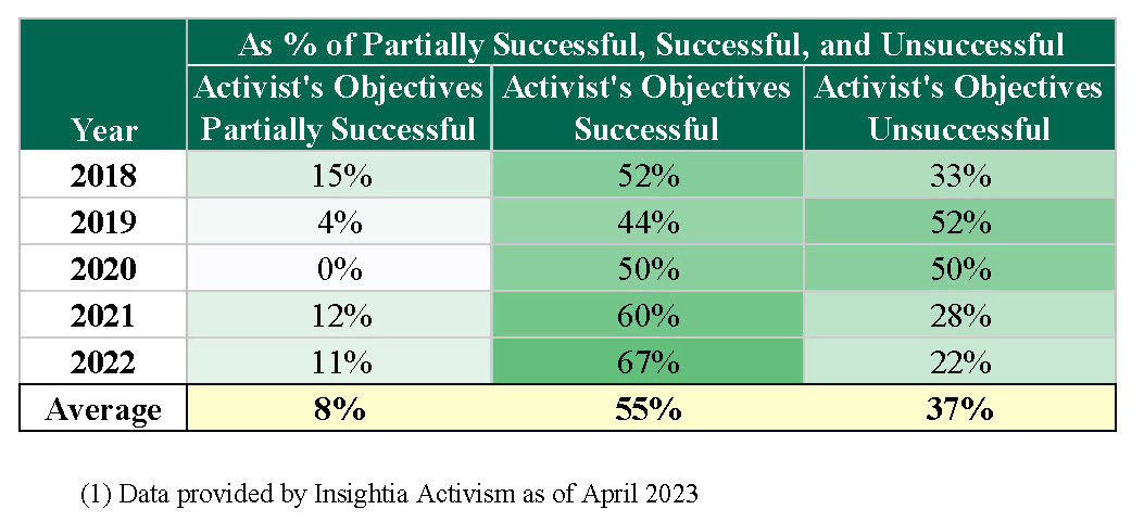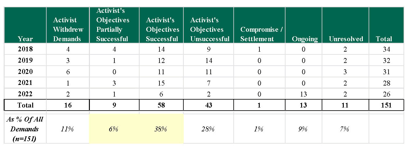 Our research indicates that from 2018 to 2022, there were 151 initiatives launched by activist investors to mandate share repurchase or returns of cash to shareholders. The activist demands were mostly either partially or completely successful at 44% (6% and 38% respectively). Activists are classified based on their “focus” per Insightia Activism [1]. Our research includes “Primary Focus” activists such as Carl Icahn and Bulldog Investors, “Partial Focus” activists such as Saba Capital Management, “Occasional” activists such as Kinesic Capital, and a few “Concerned Shareholder” activists as well.