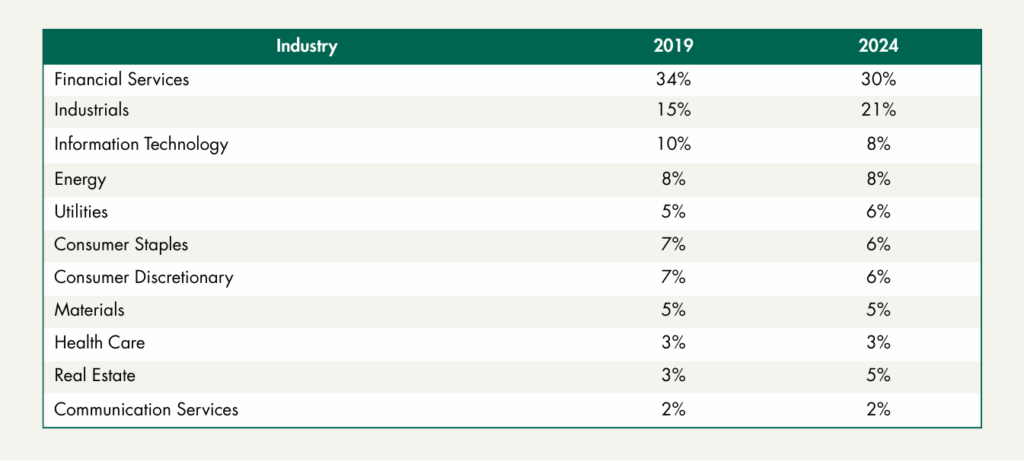 Of the companies in the S&P 500 that utilized relative financial metrics, companies in Financial Services and Industrials use them the most, with prevalence of 30% and 21% respectively in 2024. The prevalence of relative financial metrics by industry has generally held steady since 2019.