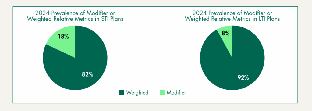The majority of companies using relative financial metrics incorporate them as weighted metrics as opposed to incorporating as a modifier on the overall results.