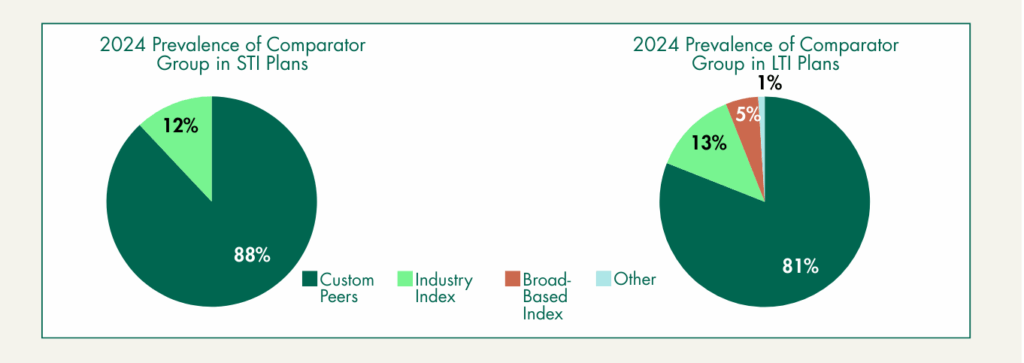 When measuring relative performance, most companies compare their performance against a custom peer group, followed by an industry index. Companies develop a custom peer group or use an industry index with the intent to measure against companies which have similar business characteristics and impacted by external factors in similar ways.