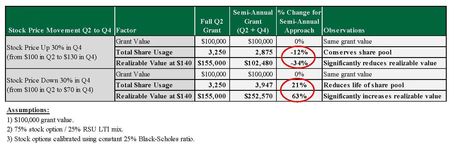 The example below illustrates how moving to semi-annual/quarterly equity granting can create significant variation in both long-term realizable equity value for participants and share usage depending on share price movement. For these reasons, some companies should consider this approach as a long-term smoothing mechanism rather than a one-off tactic that would create short-term “winners” or “losers” depending on share price movement during the year.