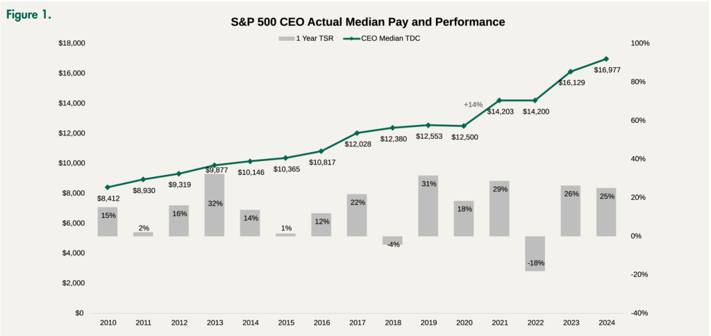 CEO actual TDC outcomes have historically tracked S&P 500 TSR performance. Median CEO actual TDC reached approximately $16.1M in 2023, reflecting a 14% year-over-year increase supported by strong S&P 500 TSR of approximately 26%. In 2024, median CEO actual TDC grew at a more moderate pace, rising by only 5%, from $16.1M to approximately $17M (Figure 1).
