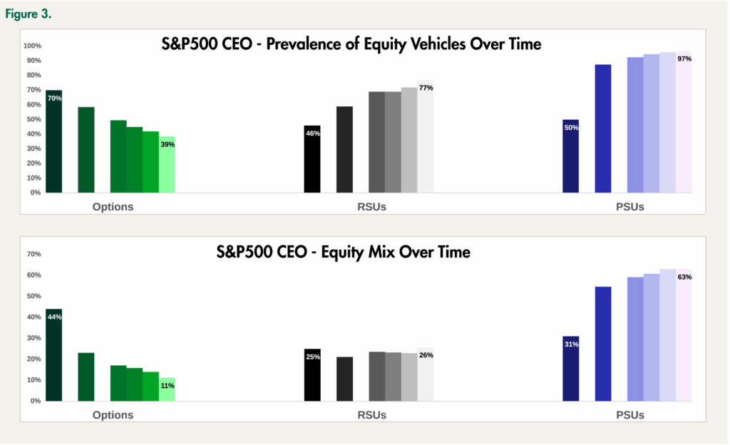 Performance-based equity remains the predominant CEO LTI vehicle across the S&P 500 (Figure 3). Over time, performance- and time-based awards have increased while stock options have declined.