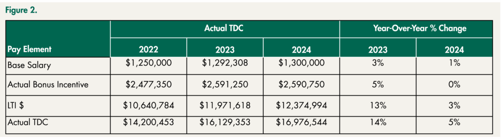 CEO actual TDC shows steady growth, primarily driven by LTI (Figure 2). Base salary and actual bonus incentives increased modestly each year. In contrast, LTI remained the largest driver of compensation increase, increasing 13% in 2023 and a further 3% in 2024.
