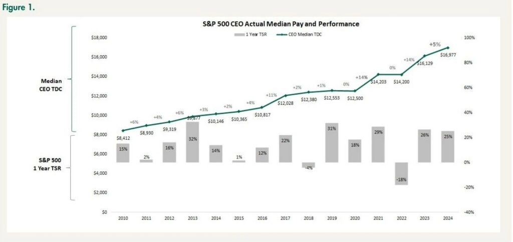 CEO actual TDC outcomes have historically tracked S&P 500 TSR performance. Median CEO actual TDC reached approximately $16.1M in 2023, reflecting a 14% year-over-year increase supported by strong S&P 500 TSR of approximately 26%. In 2024, median CEO actual TDC grew at a more moderate pace, rising by only 5%, from $16.1M to approximately $17M (Figure 1).