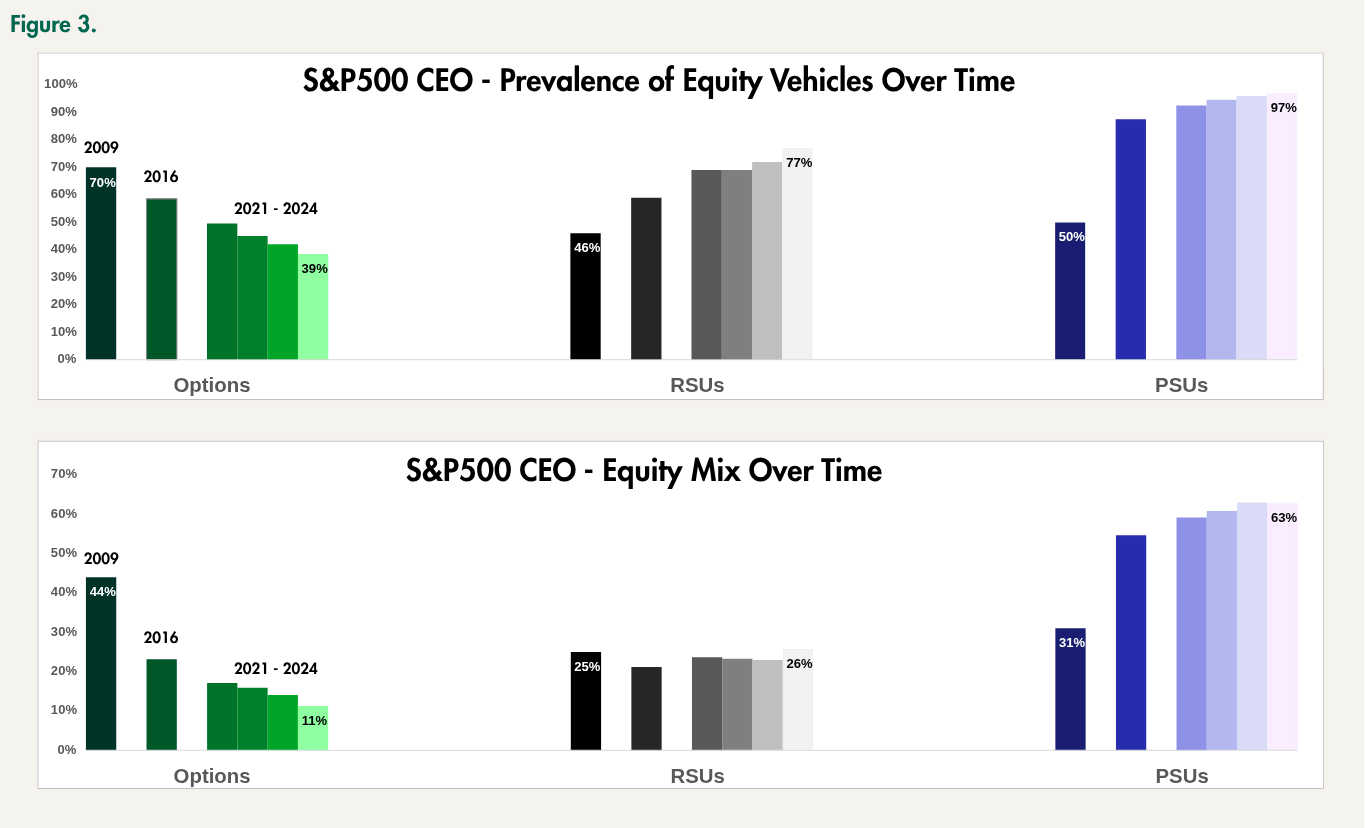 Performance-based equity remains the predominant CEO LTI vehicle across the S&P 500 (Figure 3). Over time, performance- and time-based awards have increased while stock options have declined.