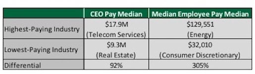 The median of “median employee pay” at these companies ($70,129) is substantially above the average salary in the U.S. economy. There is substantial variation for employee pay by industry but not by company size. Table 2 shows there is much larger industry variation for employee pay than for CEO pay. This variation explains the correlation differences shown above.
