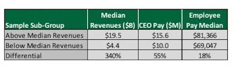 In contrast, Table 3 below shows that the relationship is inverted for company size, with company revenue impacting CEO pay significantly more than employee pay.