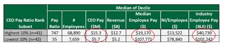 We find that median employee pay is a larger driver of high CEO pay ratios. While the lowest ratio companies have median employee pay of $108,000, the highest-ratio companies have median employee pay of $19,000 (around 17% of the high ratio company employee pay). Is it possible that the high-ratio companies consistently underpay their employees relative to the appropriate labor market? After examining company median pay versus industry pay data below, we have reached the following conclusion: “No.”