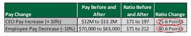 Table 5 shows that, at the median ratio, a 10% increase in CEO pay increased the ratio by 25.6 points (from 171:1 to 197:1), while a 10% decrease in employee pay increased the ratio by 40.6 points (from 171:1 to 212:1). This is further evidence that the employee pay level is at least as impactful on the ratio as the CEO pay level, if not moreso.